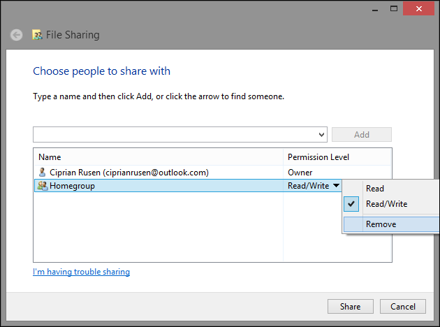 To share the resource, click or tap the drop-down list near the “Add” button. You will see a list with all the user accounts that exist on your Windows device, an entry for the Homegroup and an entry named “Everyone”.
